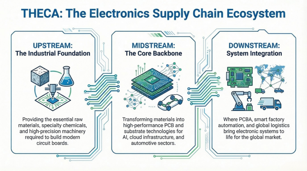 The upstream sector forms the foundation of the electronics industry, supplying the materials, chemicals, and high-precision machinery required to produce modern circuit boards and electronic systems.